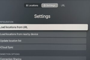 続いて、Apple TV側のFloxcoreアプリを開き、同様に「Settings」を選択したあとで「Load locations from URL」を選びます。