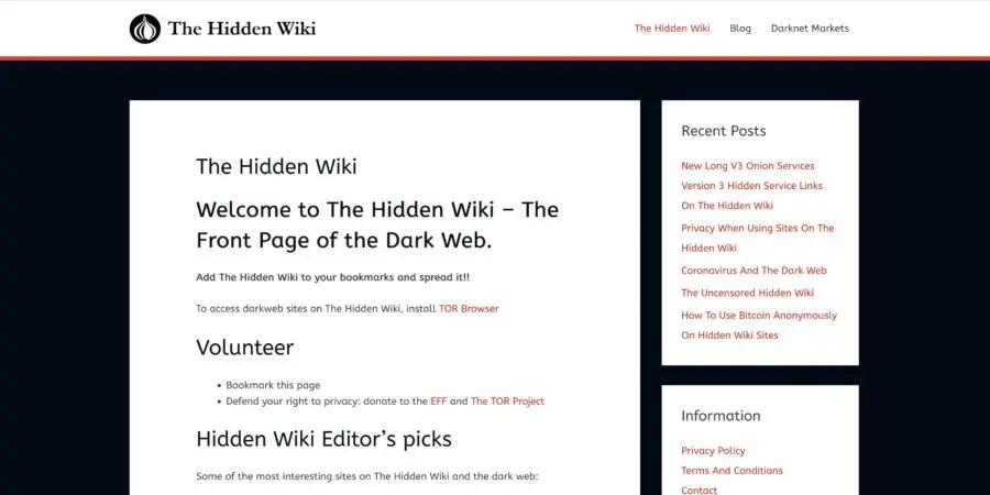 • Hidden Wiki は、一般的な「Wikipedia」のような体裁をとりながら、Torネットワーク上でアクセスできるウェブサイトへのリンク集をまとめています。