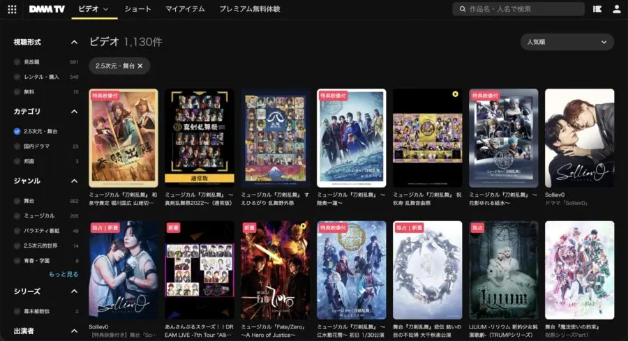 アニメーション作品に加えて、コミックやアニメを題材とした「2.5次元ステージ」関連のコンテンツが豊富に揃っているという点も、このサービスの大きな魅力となっています。