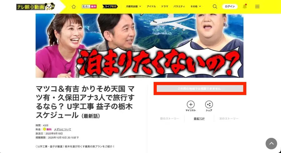 海外からテレ朝動画にアクセスするとエラー画面が表示され、動画を見ることはできません。
