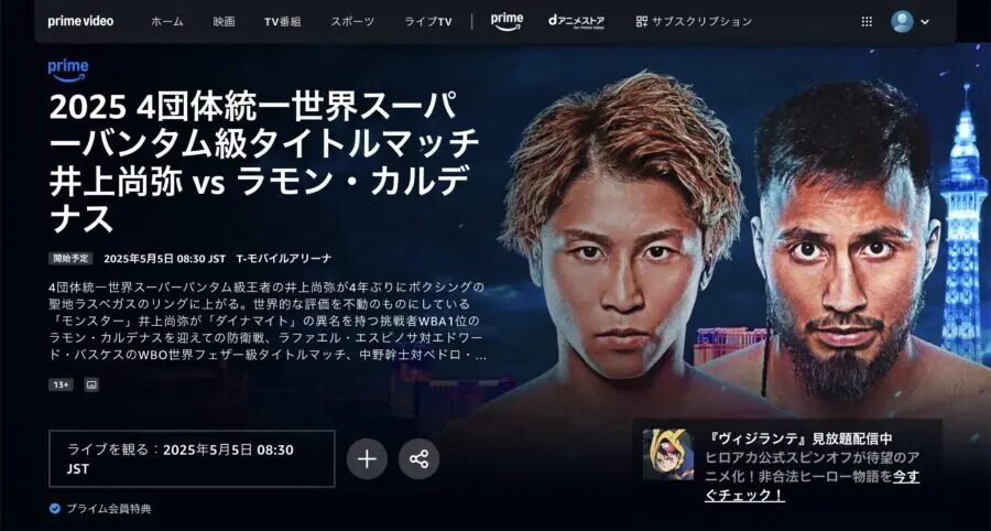 上尚弥vsカルデナス戦のライブ配信は、Amazonプライム会員であれば無料視聴が可能です。