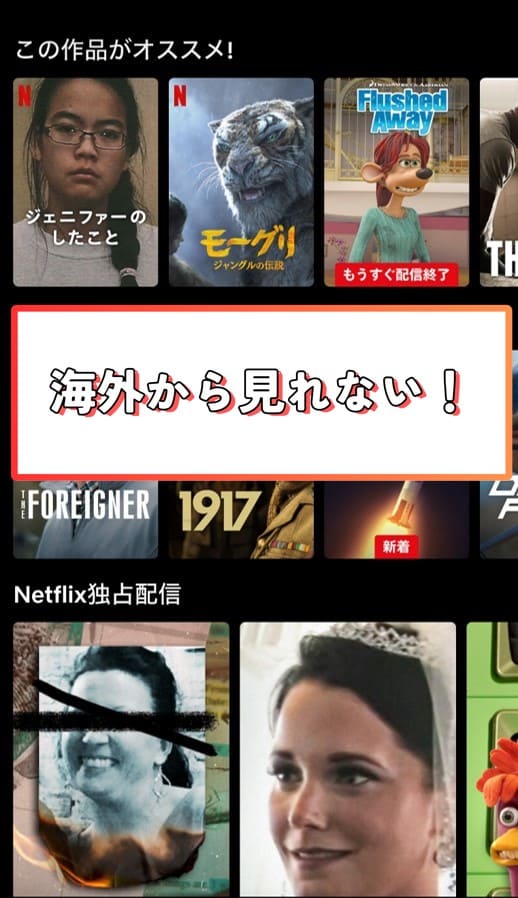 海外からNetflixにアクセスすると海外版Netflixに変わってしまうため、日本版Netflixを見ることはできません。