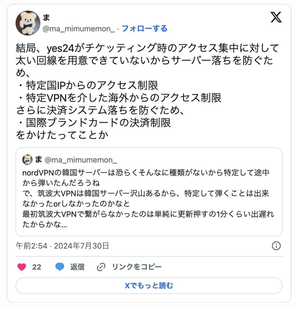 韓国のチケット販売サイトは販売開始と同時にアクセスが集中するため、わずかな速度差が成功と失敗を分けます。さらに厄介なことに、一部のチケッティングサイトでは韓国国外からのアクセスを意図的に制限しています。