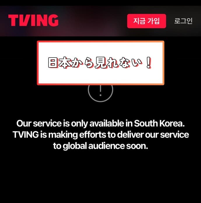 TVINGは韓国国内でのみ配信されているため、日本のIPアドレスからのアクセスではコンテンツを視聴できないのです。