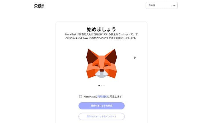MetaMaskの新規ウォレットを作成するMetaMaskのページが表示されます。