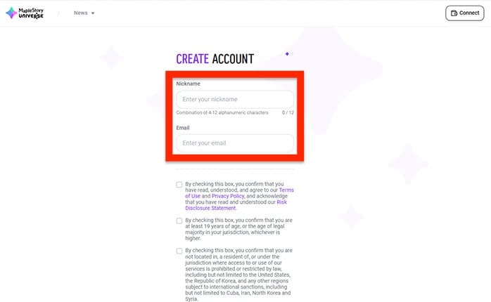 MapleStory Universe(メイプルストーリーユニバース)のアカウント作成画面が表示されます。