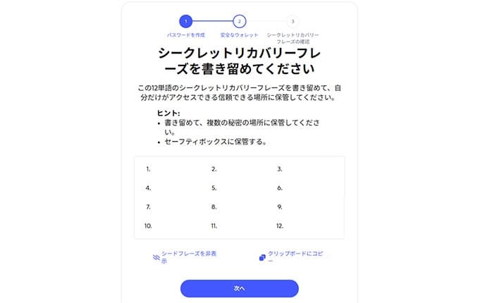 シークレットリカバリーフレーズをメモする