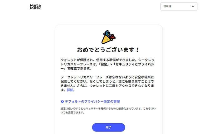 "おめでとうございます!ウォレットが保護され、使用する準備ができました"というメッセージが表示されたら完了です。