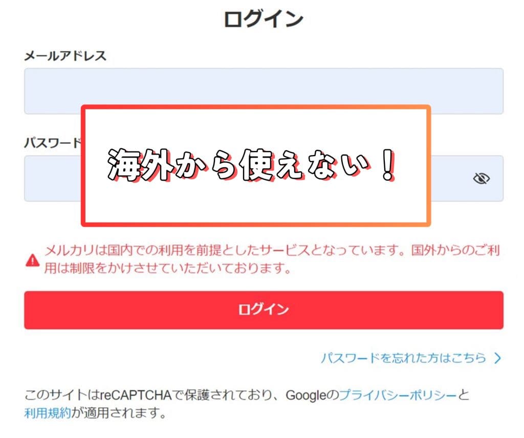 メルカリの場合、海外からログイン・購入ができなくなっています。