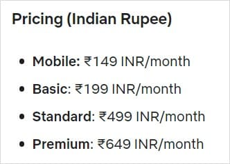 VPNを利用してインド経由でNetflixに加入すると、以下のような料金体系でサービスを利用することができるんです!