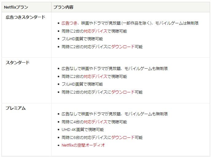 現在、Netflixには以下の3つの料金プランが用意されています。