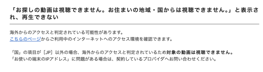 海外から該当する動画へアクセスした際に「お住まいの国・地域からは視聴できません」といったエラーメッセージが画面に表示されるのは、まさにこのような著作権上の制約が存在するからです。