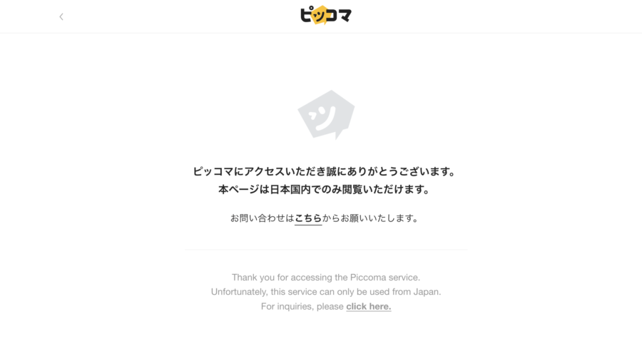 海外からピッコマにアクセスするとエラー画面が表示され、サービスを使うことができません。