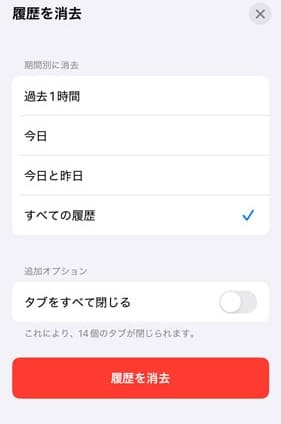 - 確認画面で「すべての履歴」を選択後、「履歴を消去」ボタンをタップ