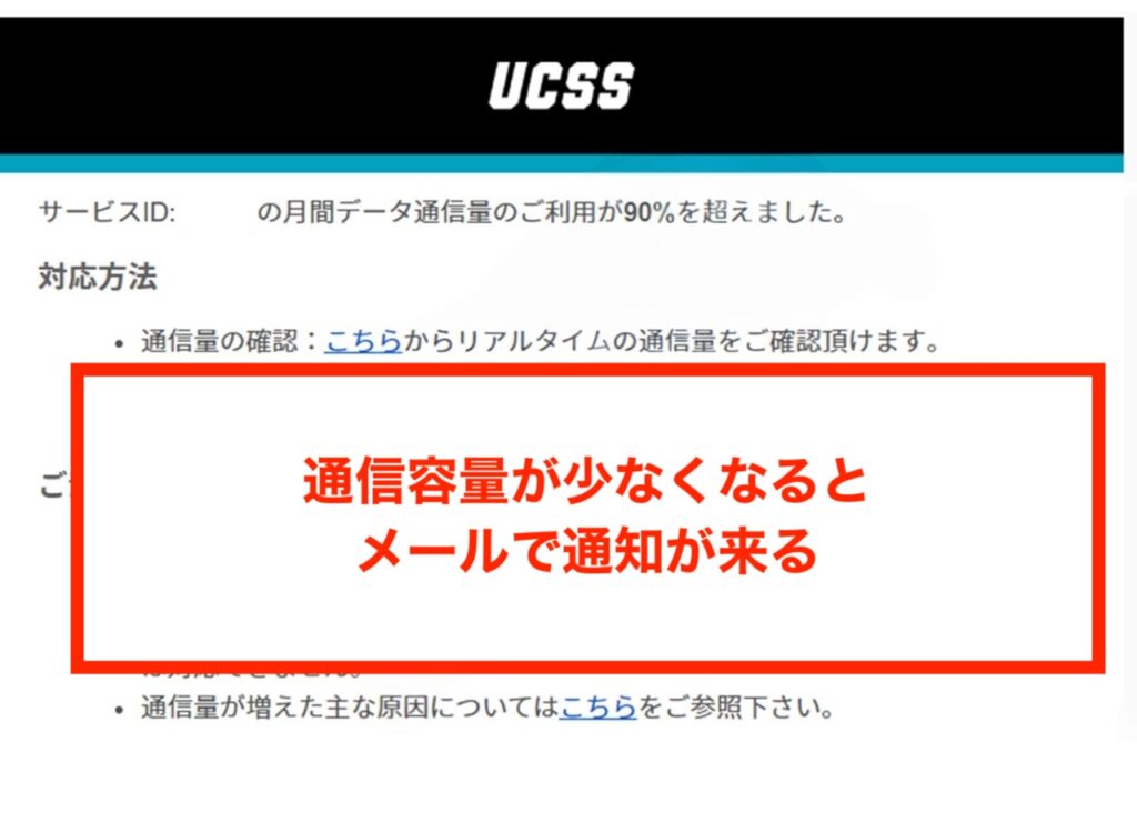 なお、通信容量はUCSSのマイページ内で確認できるほか、使用量が90%を超えると以下のようにメールで通知が来ます。