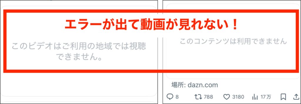 X(Twitter)を閲覧中に、動画再生時に「このビデオはご利用の地域では視聴できません」「このコンテンツは利用できません」といったメッセージが現れることがあります。